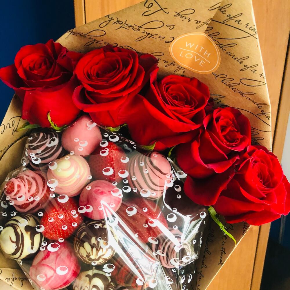 Клубника в шоколаде – 500 гр.Роза – 5 шт.Упаковка дизайнерская – 1 шт.