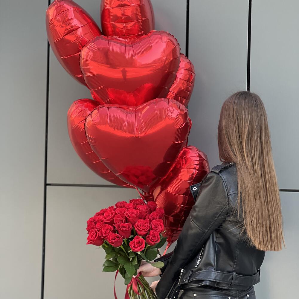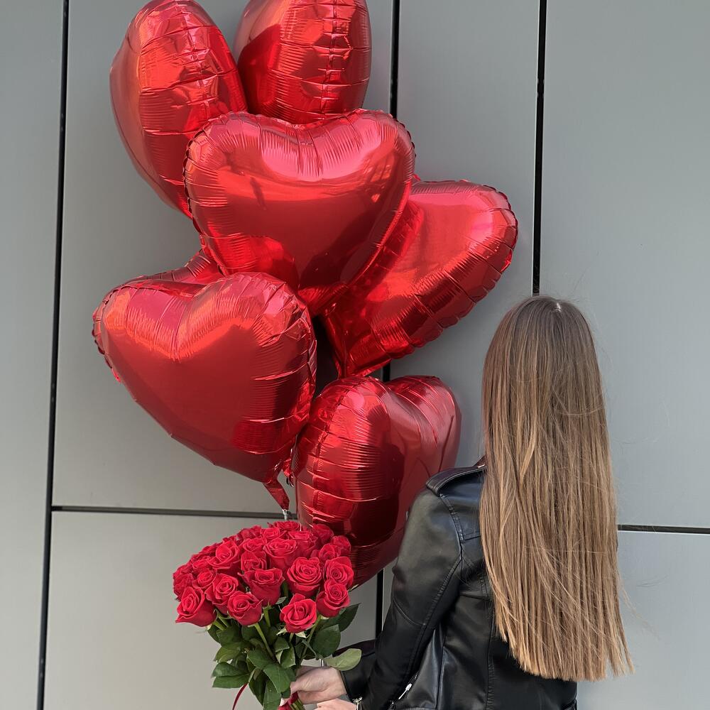 Комбо из букета из 25 красных роз и сета шаров (фольгированные сердца 7 шт.)