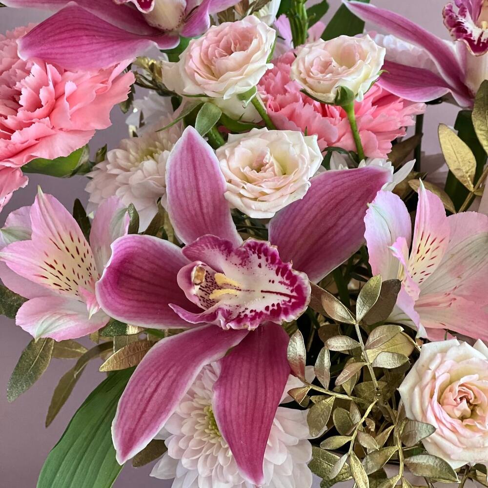 Альстромерия – 1 шт.Орхидея Цимбидиум – 3 шт.Папоротник – 1 шт.Роза кустовая – 1 шт.Хризантема кустовая – 1 шт.Гвоздика – 2 шт.Фисташка – 2 шт.Коробка брендированная – 1 шт.Роза пинк мондиаль – 1 шт.Губка флористическая – 1 шт.