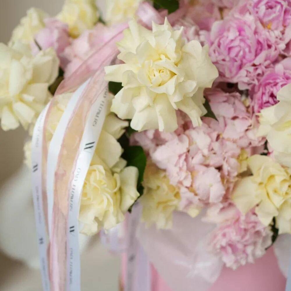 Гортензия – 10 шт.Пион – 30 шт.Шляпная коробка с лентами – 1 шт.Открыточка с вашими пожеланиями – 1 шт.Роза mondial – 35 шт.Оазис флористический – 4 шт.