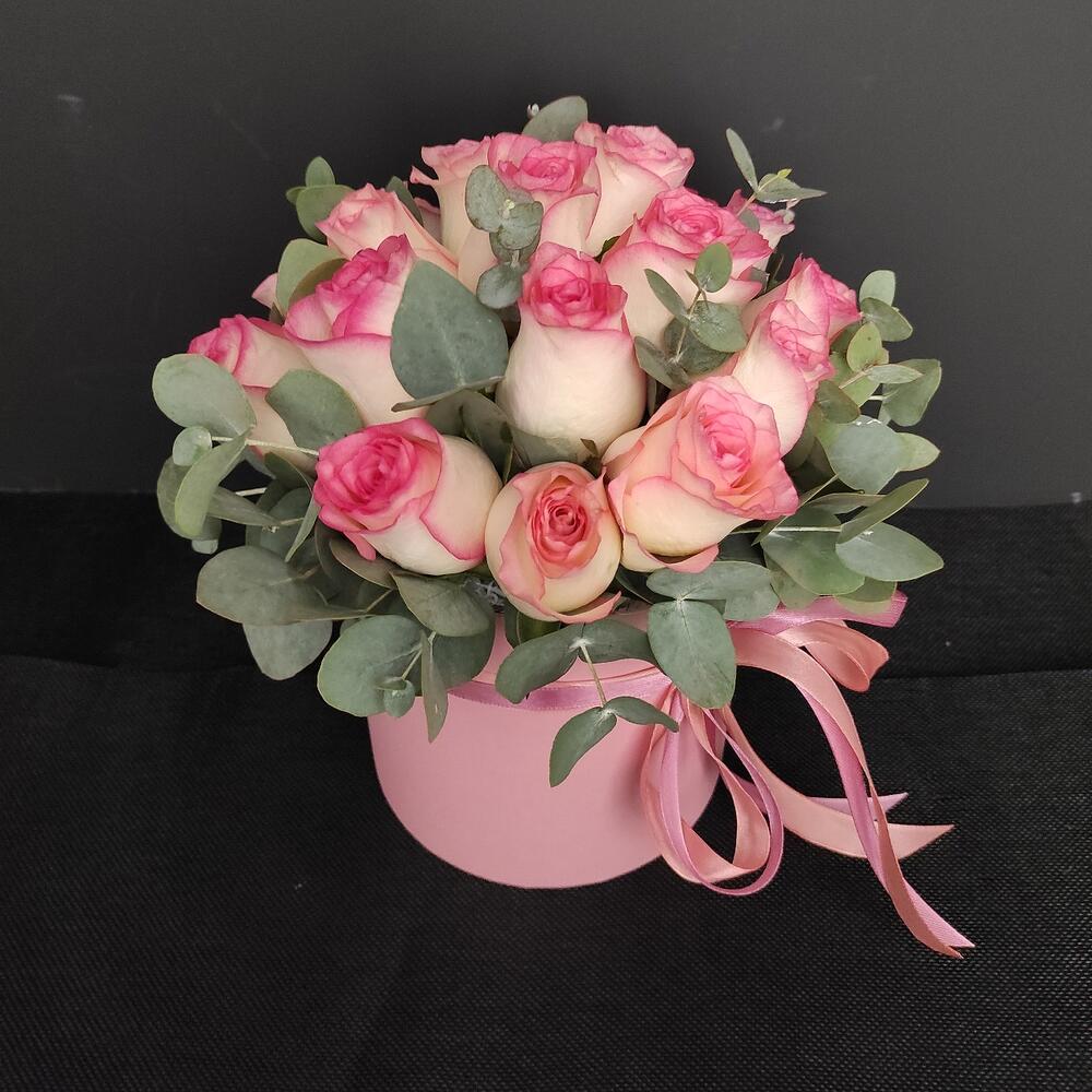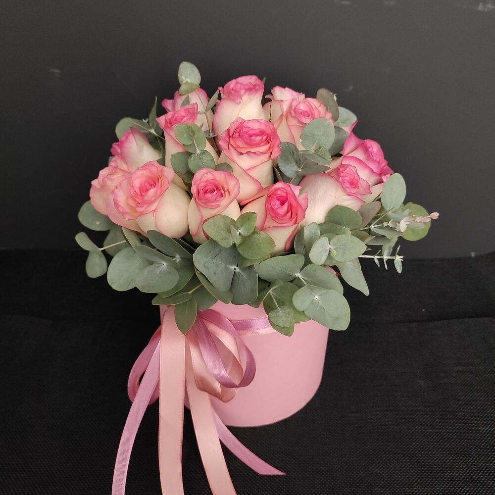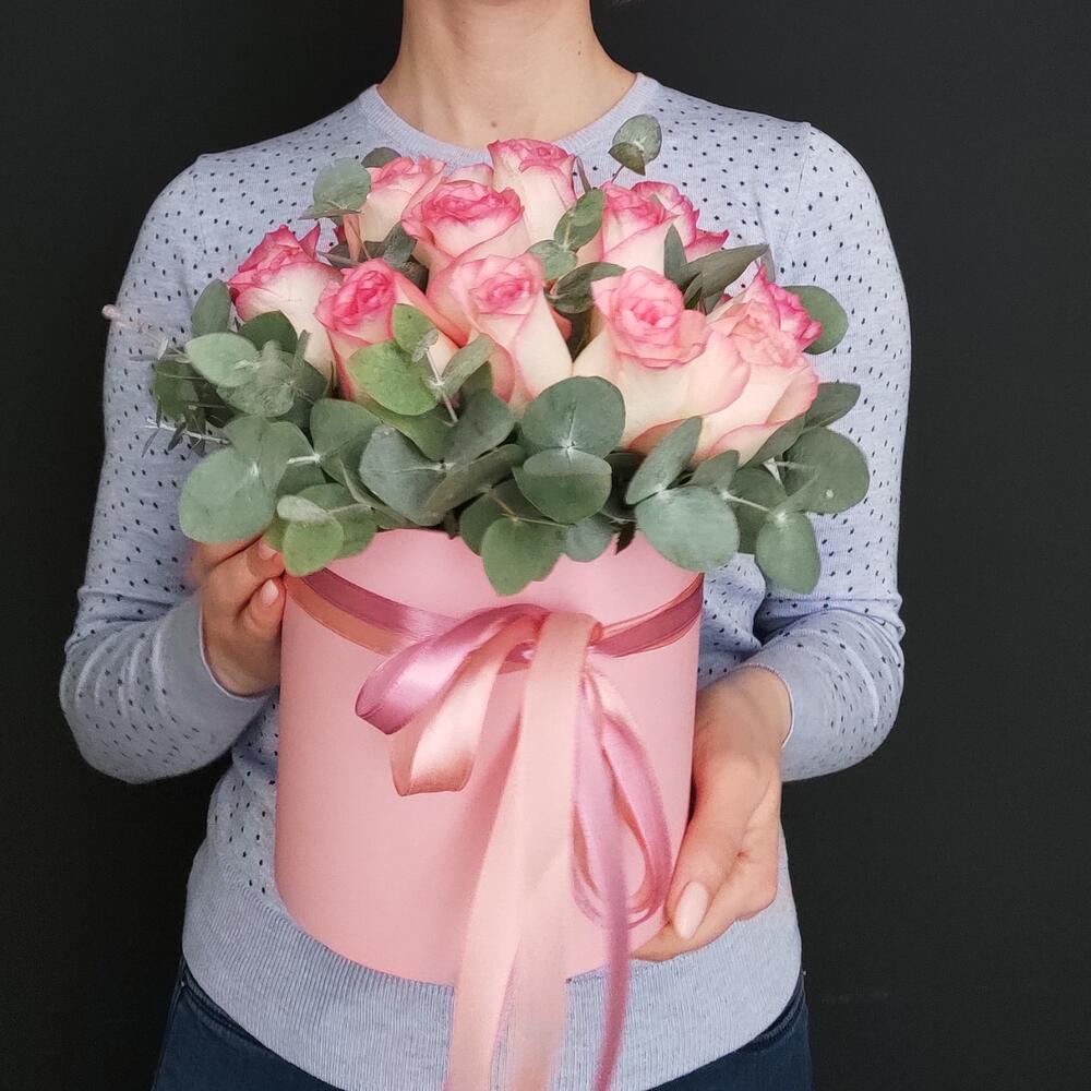 Роза – 19 шт.Эвкалипт – 2 шт.Оазис флористический – 2 шт.Коробка шляпная – 1 шт.