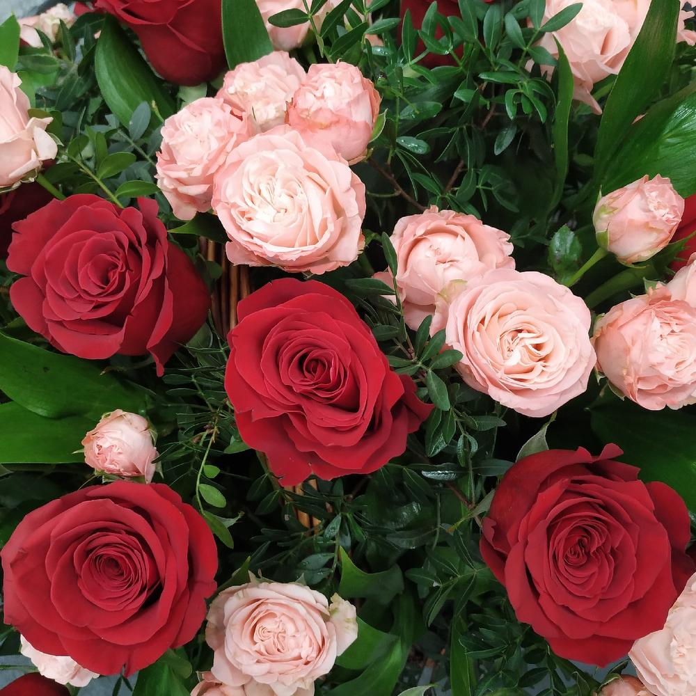 Роза Эквадор – 25 шт.Роза кустовая розовая – 11 шт.Фисташка – 5 шт.Зелень – 5 шт.Корзина плетеная – 1 шт.Оазис – 2 шт.
