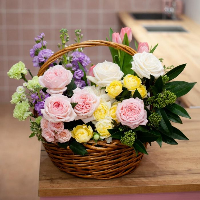 Метки: от 5000 руб, цветы в корзине
