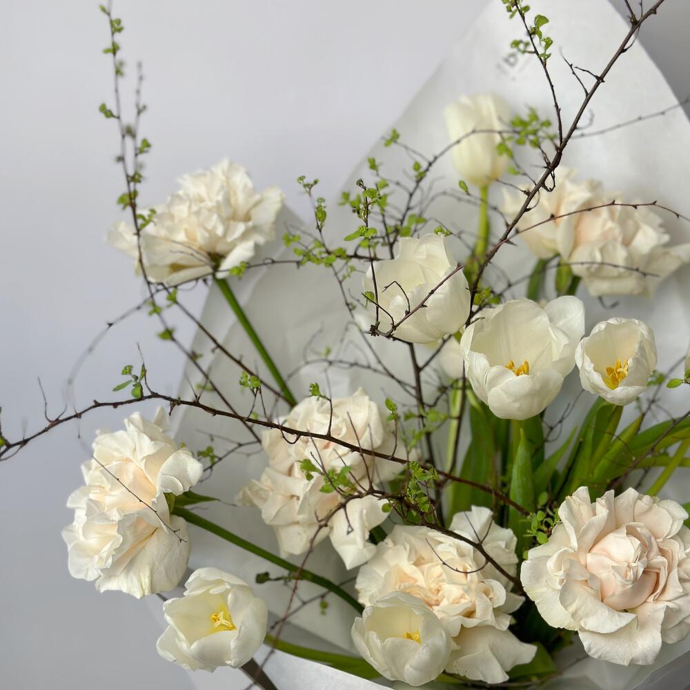 Пионовидная роза – 7 шт.белые тюльпаны – 10 шт.Спирея – 2 шт.