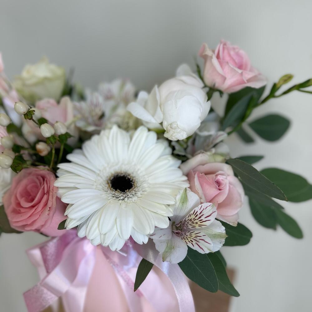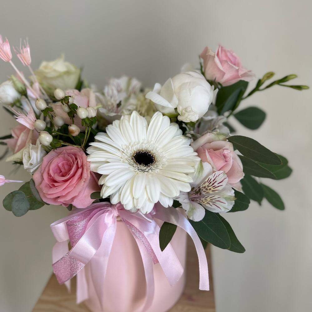 Гербера – 1 шт.Пион – 1 шт.Роза – 5 шт.альтстомерия – 2 шт.Эвкалипт – 1 шт.Гиперикум – 1 шт.Сухоцвет – 2 шт.Коробка шляпная – 1 шт.Оазис флористический – 1 шт.