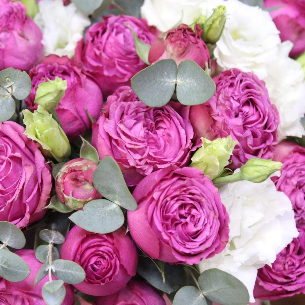 Роза пионовидная – 9 шт.Эустома – 6 шт.Эвкалипт – 5 шт.Пленка дизайнерская – 1 шт.Оазис флористический – 1 шт.Шляпная коробка – 1 шт.