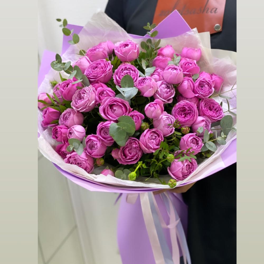 мистик баббл роза кустовая – 25 шт.зелень пучок – 2 шт.Упаковка дизайнерская – 5 шт.Лента атласная – 3 шт.