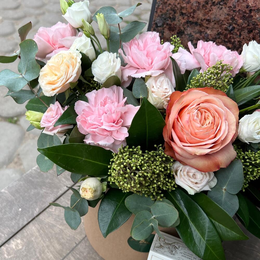 Лизиантус – 1 шт.Роза кустовая – 1 шт.Эвкалипт – 3 шт.Роза Эквадор – 1 шт.Шляпная коробка – 1 шт.Скиммия – 3 шт.Оазис флористический – 1 шт.Диантус сортовой – 4 шт.печенье «счастье» ангел – 1 шт.