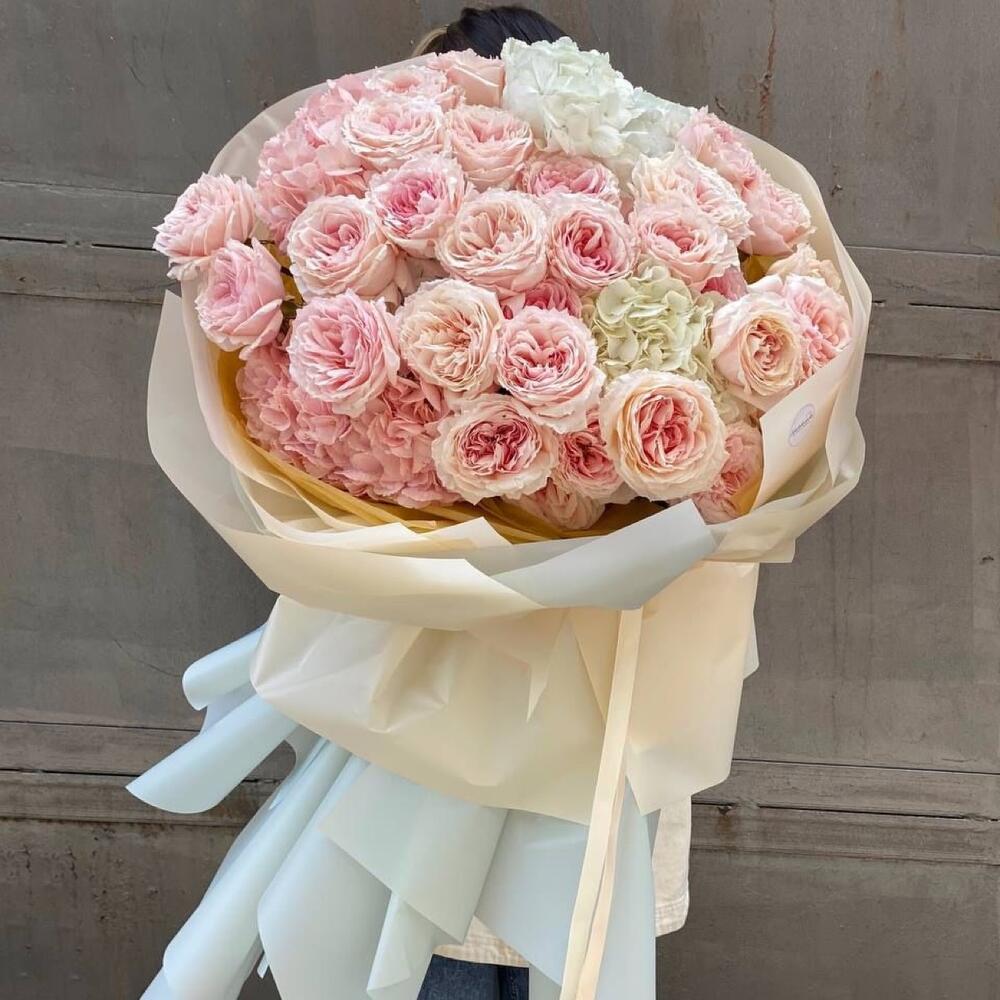 “Эвкалиптическая роскошь” гортензия и пионовидная кустовая роза