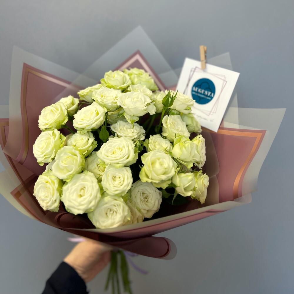 Роза кустовая – 7 шт.Упаковка дизайнерская – 1 шт.Лента атласная – 1 шт.