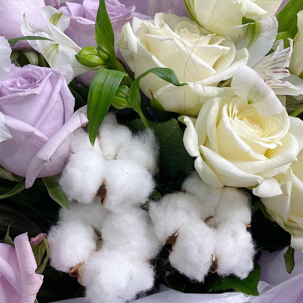 Альстромерия – 2 шт.Хлопок – 3 шт.Роза белая – 5 шт.Роза сиреневая – 7 шт.Упаковка дизайнерская – 1 шт.стифа пучок – 4 шт.