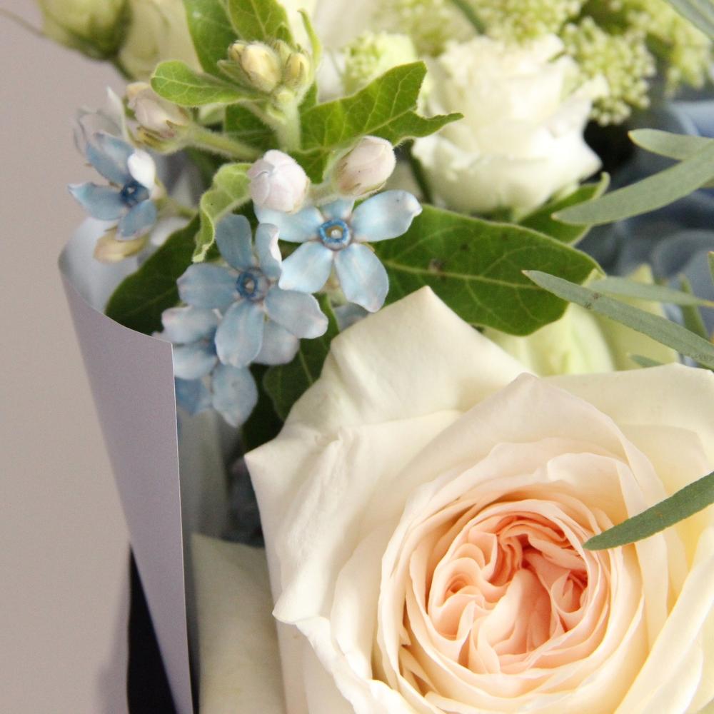 Гортензия – 1 шт.Анемон – 3 шт.Роза пионовидная – 3 шт.Твидия – 2 шт.Астра – 3 шт.Амми – 2 шт.Лизиантус – 2 шт.флебодиум – 2 шт.Эвкалипт – 3 шт.Упаковка – 2 шт.Лента атласная – 1 шт.