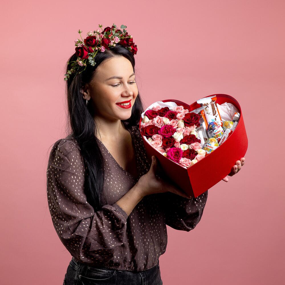 “Сладкое сердце ” – цветочная композиция с сладостями в коробке “Сердце”