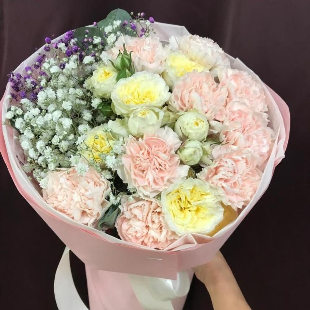 Альстромерии, Гвоздики, Кустовые розы, Лизиантусы, Розы, Хризантемы