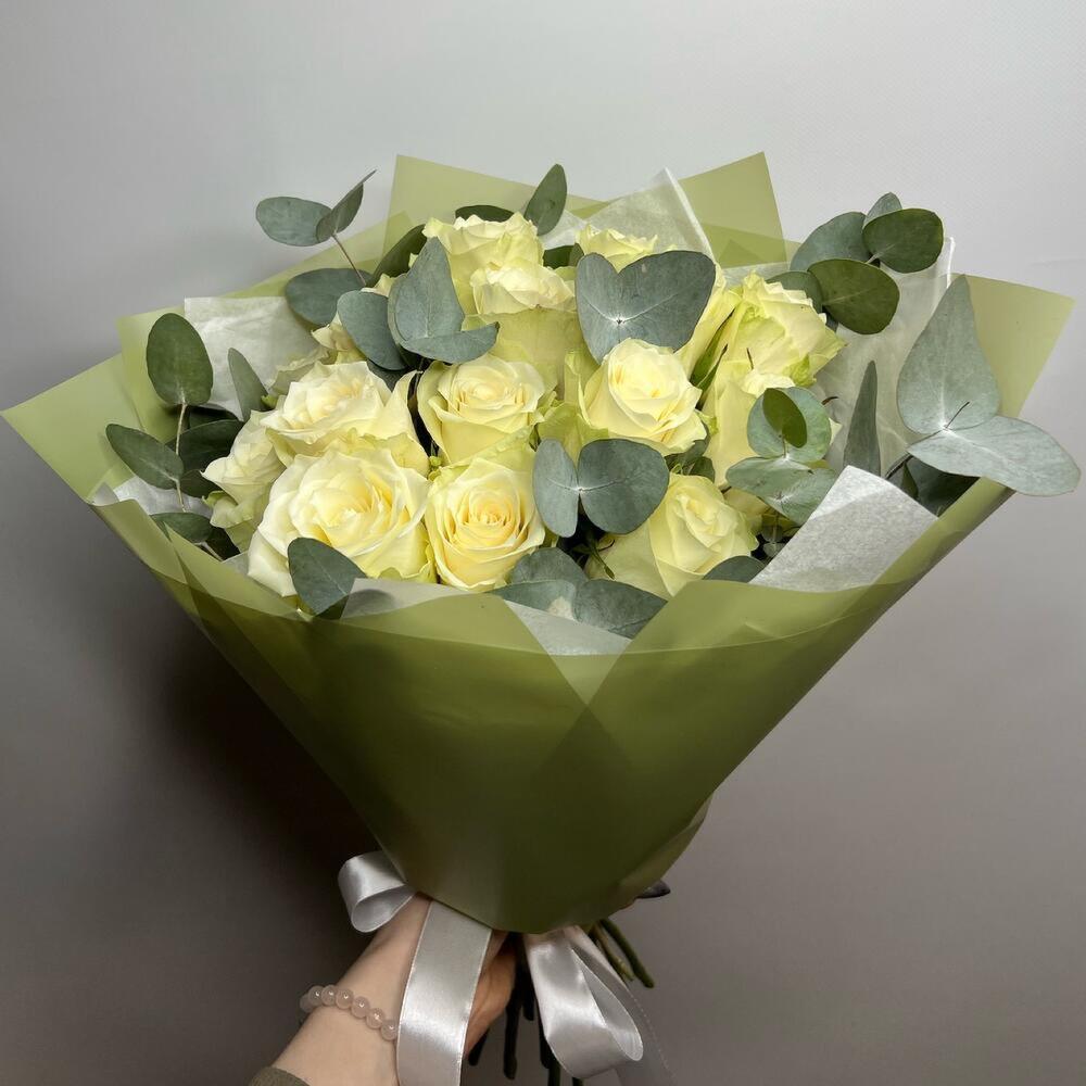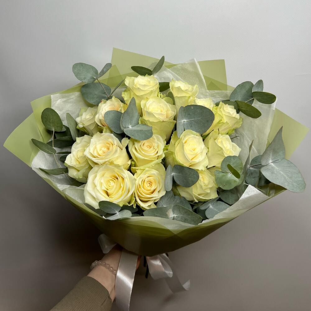 Роза персиковая – 15 шт. эвкалипт круглый или длинный – 9 шт. Упаковка дизайнерская – 2 шт. Открыточка с вашими пожеланиями – 1 шт. инструкция по уходу за цветами – 1 шт.