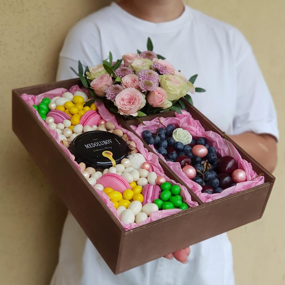 Роза кустовая – 3 шт.Хризантема Сантини – 1 шт.Конфеты Raffaello – 2 шт.Фисташка – 1 шт.Зефир в шоколаде – 5 шт.Голубика – 100 гр.Черешня – 280 гр.Пирожные макарон – 4 шт.Роза шоколадная – 1 шт.Фисташки – 30 гр.крем мед medolubov – 240 гр.банан сушеный – 150 гр.кешью в белом шоколаде – 100 гр.арахис в сахарной глазури – 140 гр.арахис в кунжуте – 140 гр.смородина в шоколаде – 20 гр.арахис в белом шоколаде – 100 гр.арахис в цветной глазури – 160 гр.рисовые шарики в шоколаде – 10 гр.транспортировочный крафт пакет – 1 шт.