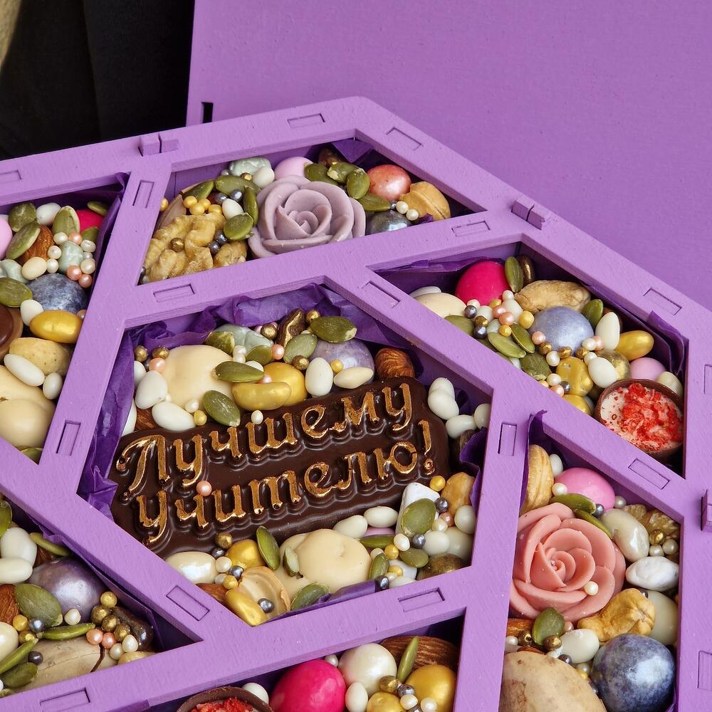 арахис в кунжуте и меде – 150 гр.арахис в сахарной глазури – 150 гр.арахис в белом шоколаде – 150 гр.Фундук – 50 гр.пекан в скорлупе – 3 шт.Грецкий орех – 50 гр.роза шоколадные – 3 шт.конфеты комильфо – 2 шт.конфета тоффи – 1 шт.Шоколадная надпись – 50 гр.грецкий орех в шоколаде – 40 гр.смородина в шоколаде – 25 гр.миндаль в клубничном шоколаде – 15 гр.арахис в цветной глазури – 16 гр.Миндаль – 20 гр.рисовые шарики в шоколаде xl – 15 гр.Кешью – 15 гр.шоколад в глазури – 15 гр.арахис в перламутре – 15 гр.семена подсолнечника в шоколаде – 15 гр.семена тыквы – 10 гр.рисовые шарики в шоколаде мини – 5 гр.