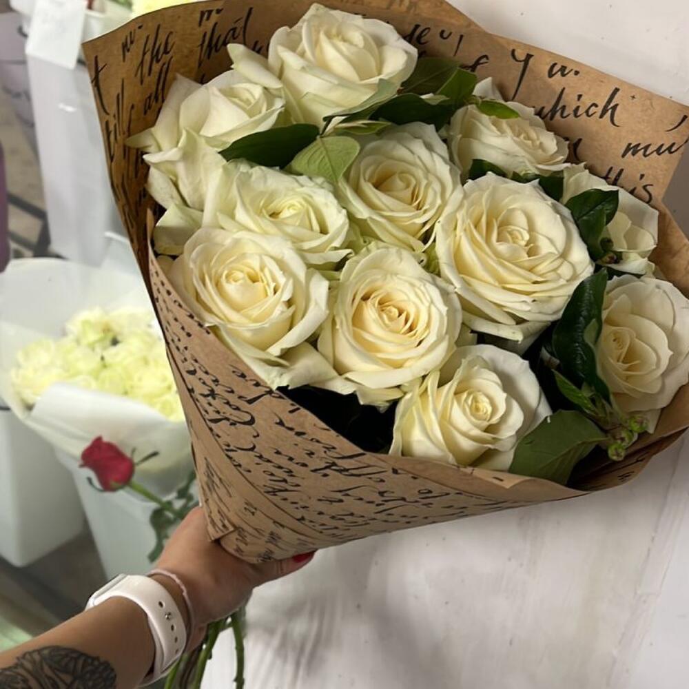 розы эквадор (70 см) – 11 шт.Лента атласная – 1 шт.Крафт упаковка – 2 шт.