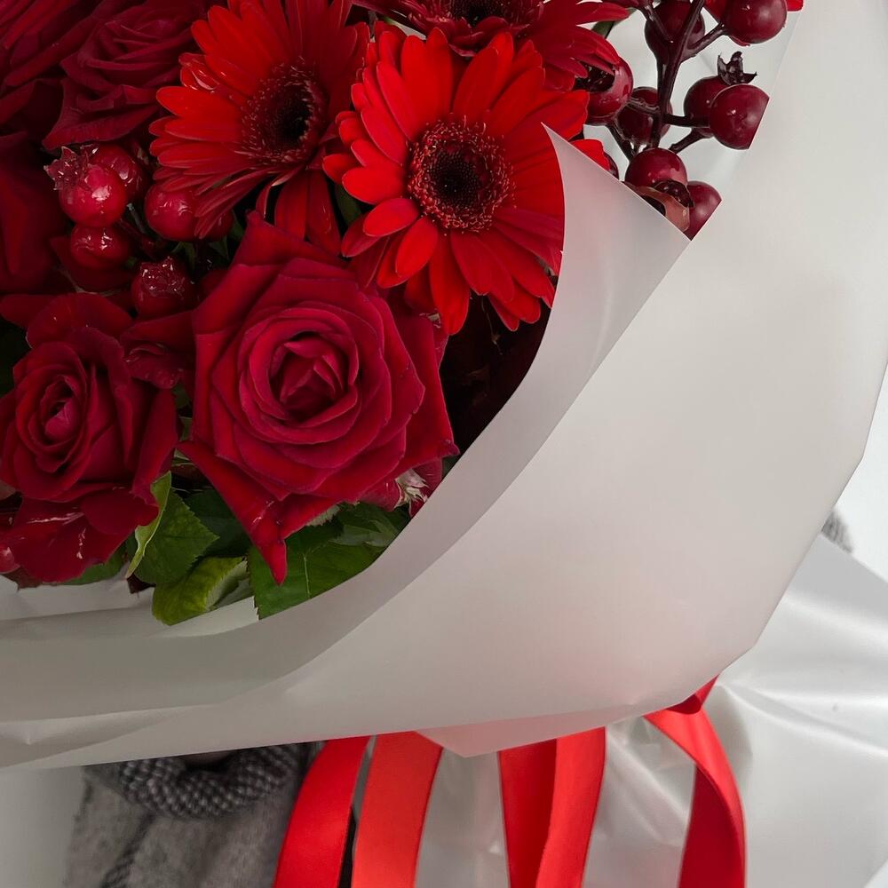 Роза – 6 шт.Гербера – 7 шт.Листья Дуба – 5 шт.Ягоды декоративные – 4 шт.Пленка матовая – 2 шт.