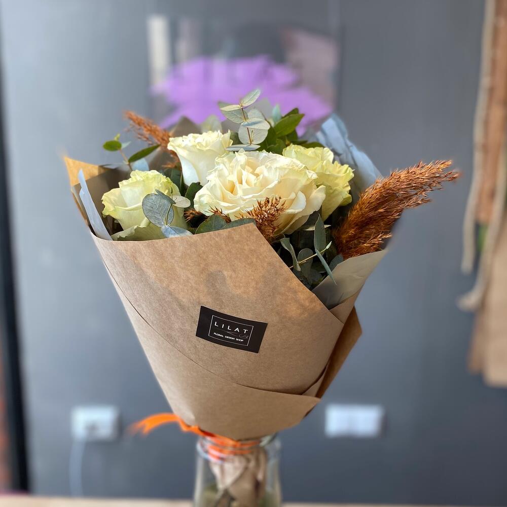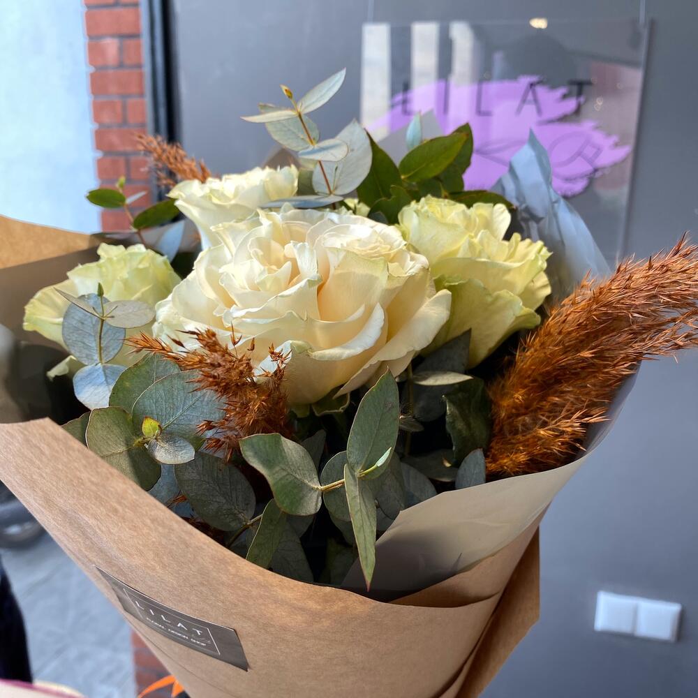 Эвкалипт – 3 шт. Крафт упаковка – 2 шт. Открыточка с вашими пожеланиями – 1 шт. розы – 5 шт.