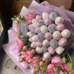 Съедобный фруктовый букет из клубники в шоколаде и роз в стильной упаковке