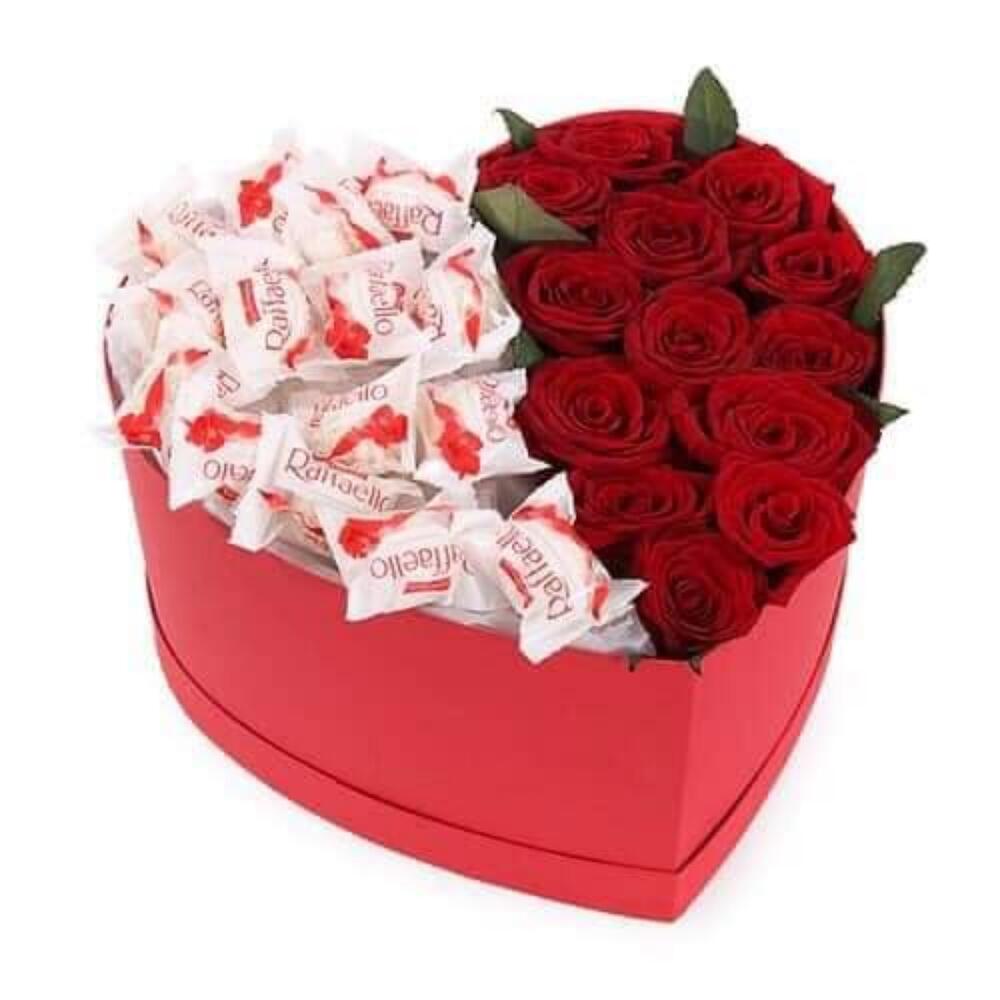 “Сладкое сердце ” – цветочная композиция с сладостями в коробке “Сердце”