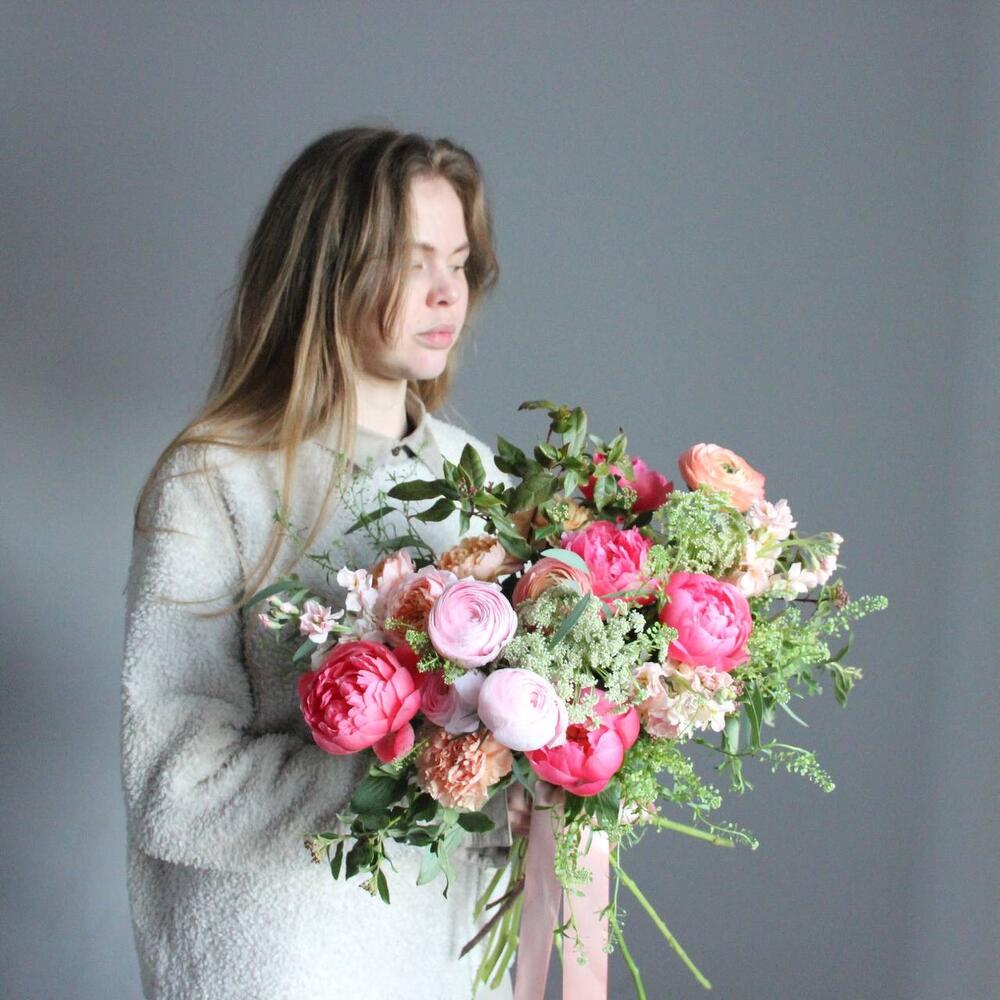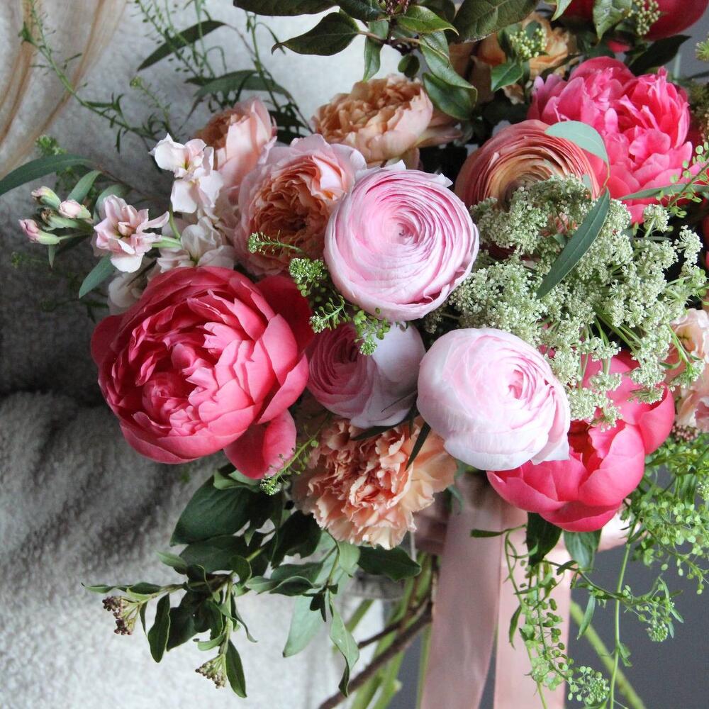 Пион – 5 шт.Амми – 2 шт.Пастушья сумка – 2 шт.Ранункулюс – 6 шт.Маттиола – 3 шт.Роза кустовая пионовидная – 1 шт.Гвоздика – 3 шт.Вибурнум – 3 шт.Лента атласная – 1 шт.
