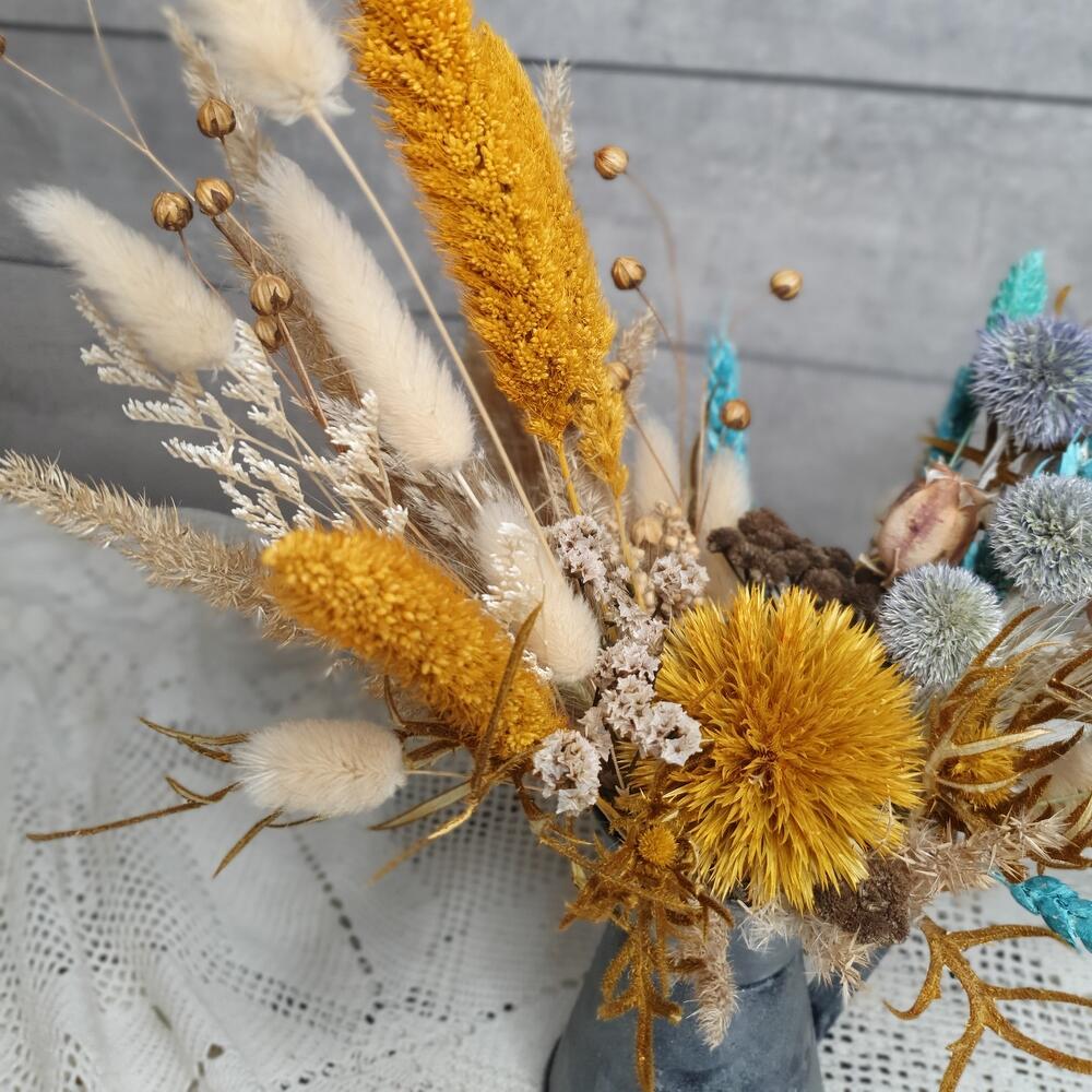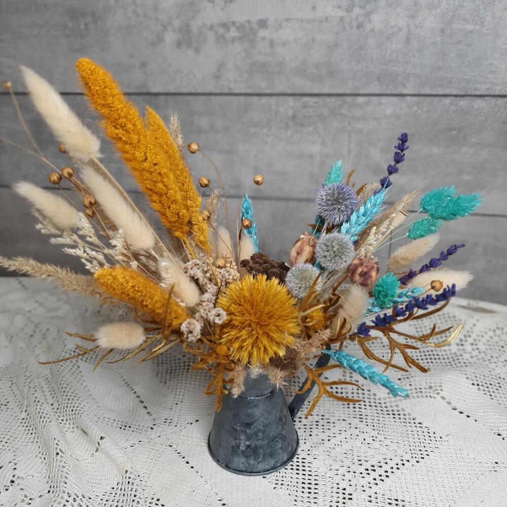 Эхинопс – 4 шт.Фаларис – 4 шт.Сетария – 3 шт.Лагурус (сухоцвет) – 10 шт.Лимониум – 1 шт.Лен – 2 шт.маковые коробочки сухоцвет – 2 шт.вейник пучок – 1 шт.стабилизированная лаванда – 3 шт.Колоски – 4 шт.стабилизированная статица – 1 шт.кашпо кувшин металическая – 1 шт.