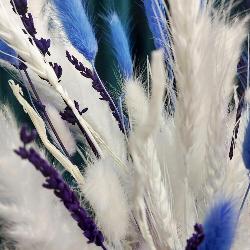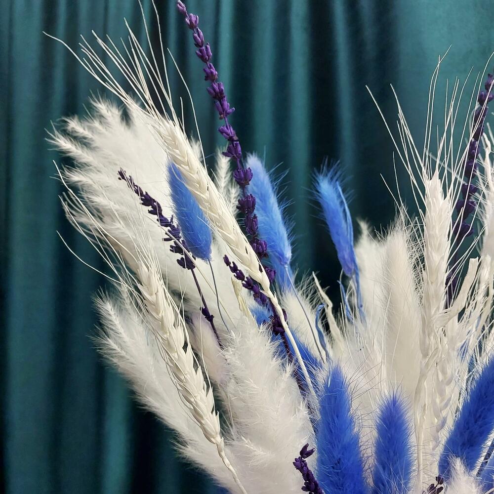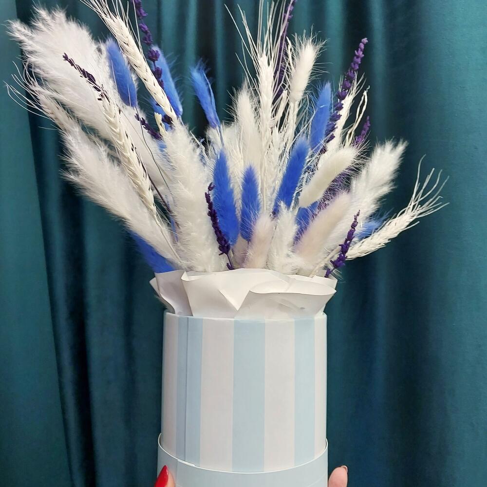 Лагурус (сухоцвет) – 7 шт.Лаванда (сухоцвет) – 2 шт.Помпасная трава – 5 шт.Пшеница (сухоцвет) – 3 шт.Оазис флористический – 1 шт.Коробка шляпная – 1 шт.