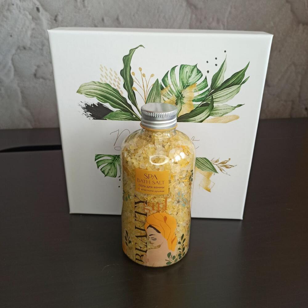 Коробка подарочная – 1 шт.свеча ароматическая лаванда и базилик – 1 шт.маска тканевая для лица – 3 шт.массажное мыло-скраб – 1 шт.расслабляющая соль для ванной с лепестками душицы – 1 шт.