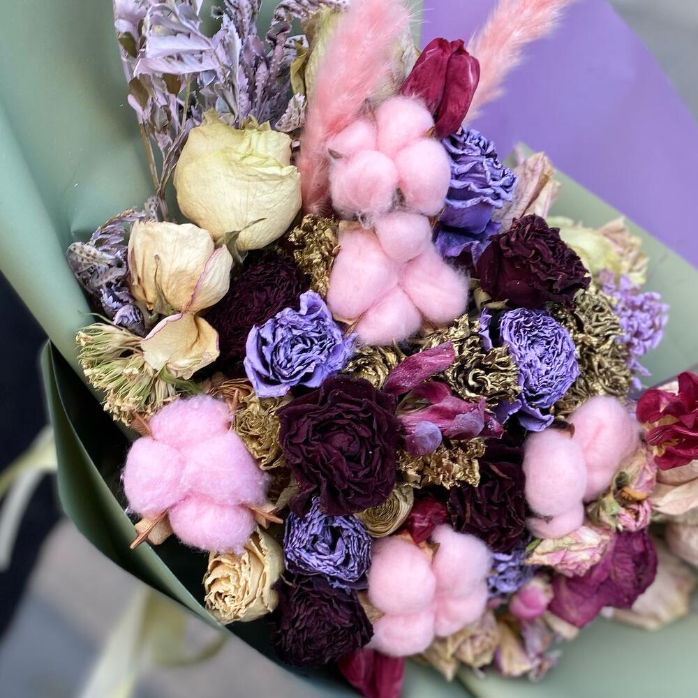 Современный практичный подарокБукетик который будет вас радовать долго.Сухоцветы- это цветы, которые не привередливые.Это отличное решение для интерьера в вашем доме или офисе.