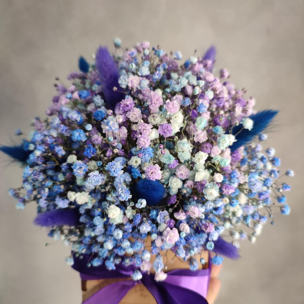 Ящик деревянный – 1 шт.Лагурус – 14 шт.Оазис флористический – 1 шт.гипсофила разноцветная – 6 шт.