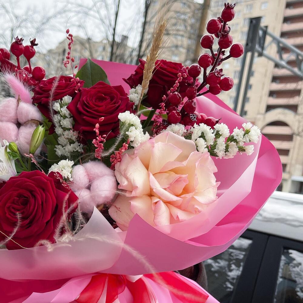 Роза красная – 6 шт.Хлопок натуральный – 3 шт.Статица – 1 шт.Салал пучок – 1 шт.Альстромерия – 1 шт.Лагурус (сухоцвет) – 3 шт.колосок полевой – 1 шт.ветка красная декоративная – 1 шт.тишью розовое – 4 шт.Пленка матовая – 6 шт.Лента атласная – 4 шт.