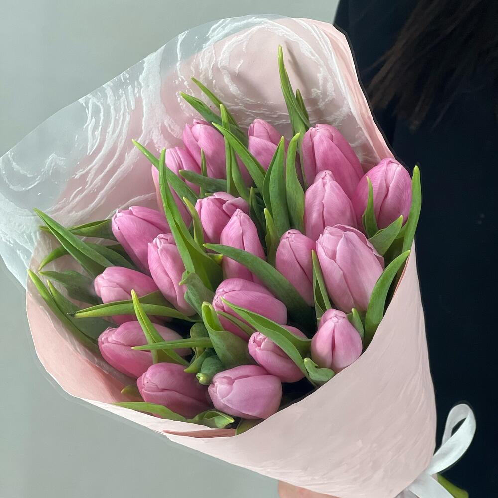 Упаковка – 2 шт.Лента атласная – 1 шт.сиреневый тюльпан – 19 шт.