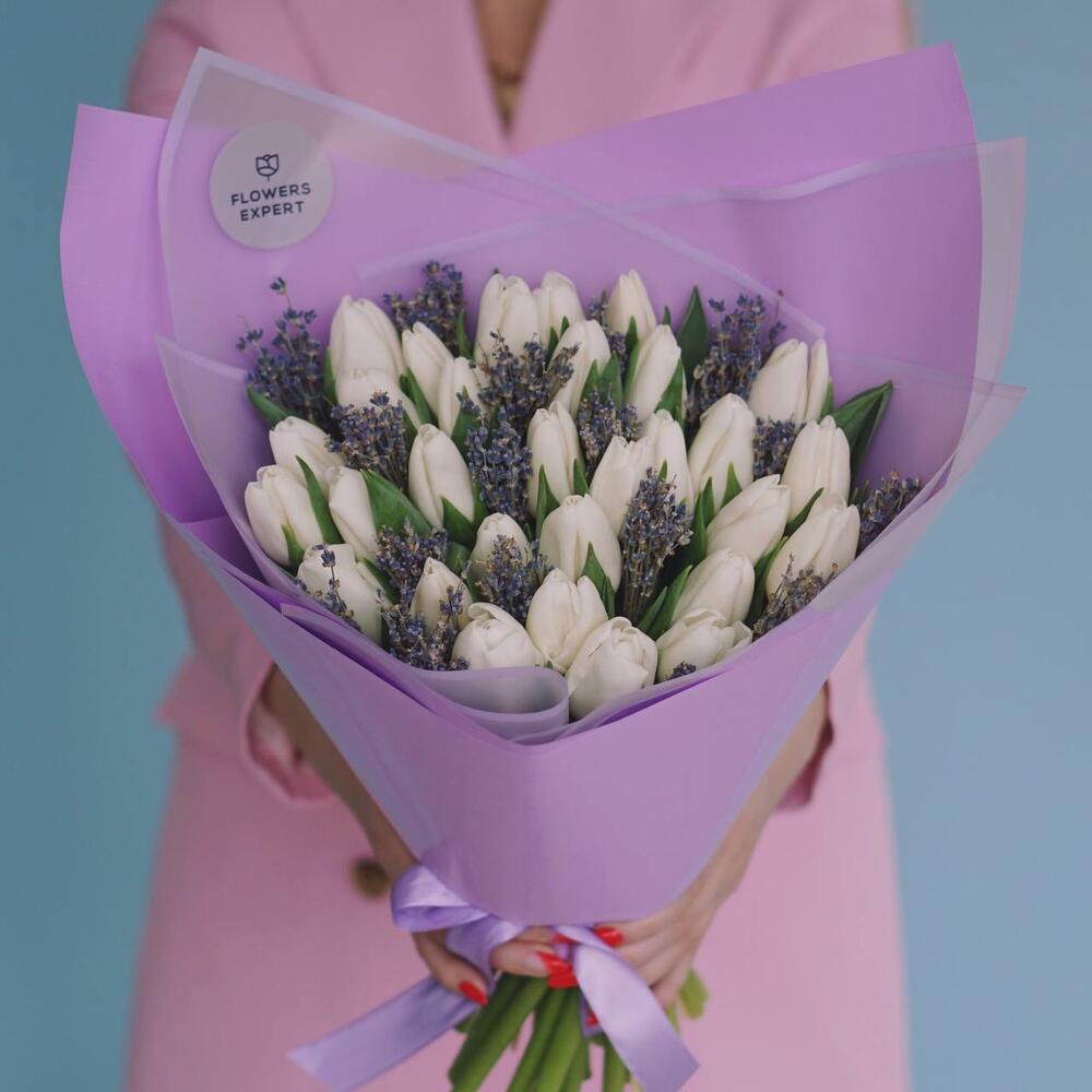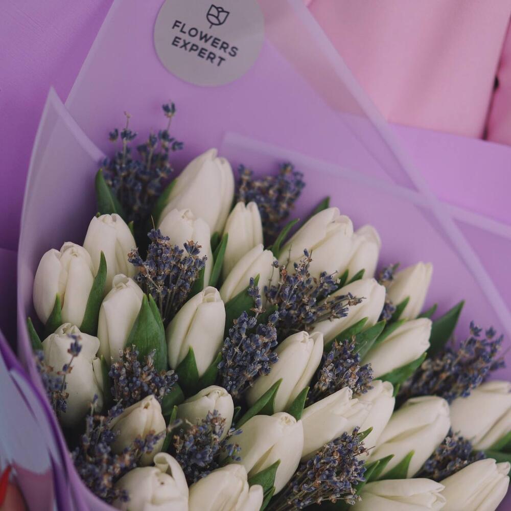 Авторский букет с белыми тюльпанами и лавандой