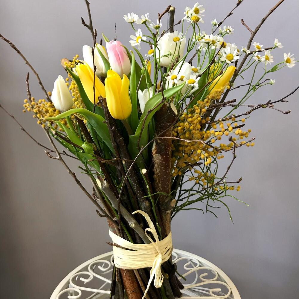 тюльпаны – 15 шт.Матрикария – 2 шт.мимоза или гипсофила желтого цвета – 1 шт.березовые ветки – 20 шт.